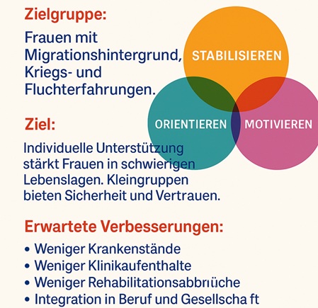 Unser Angebot besteht aus 2 Gruppen von jeweils 6 bis 10 Frauen, die Laufzeit beträgt 8 bis 12 Wochen. Dieses Pilotprojekt bestehend aus Stabilisierung und Orientierung dauert 1 Jahr.